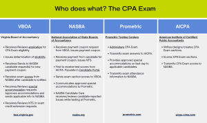 CPA 시험 과정은 주 회계사 협회, 미국 공인회계사 협회(AICPA), 주 회계사 협회 전국 협회(NASBA) 및 Prometric 간의 협력 관계로 이루어져 있습니다. 자세한 내용은 이 차트를 참조하세요.