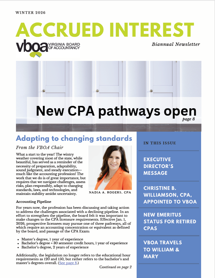 VBOA는 1년에 두 번 버지니아 공인회계사 및 시험 응시자 커뮤니티와 관련된 뉴스 및 업데이트와 함께 징계 조치에 관한 내용을 담은 뉴스레터를 발행합니다.